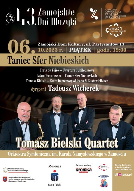 Finałowy koncert tegorocznych Zamojskich Dni Muzyki to zestawienie trzech jubileuszowych kompozycji inspirowanych ważnymi dla historii wydarzeniami, niezwykłymi postaciami oraz ich życiem i działalnością. Obok „Uwertury Jubileuszowej” Chritopha de Voise stworzonej z okazji 140-lecia istnienia Orkiestry Symfonicznej im. K. Namysłowskiego w Zamościu, tego wieczora zabrzmi także pełny symboli „Taniec sfer niebieskich” Adama Wesołowskiego upamiętniający 550 rocznicę urodzin Mikołaja Kopernika. Całości dopełni jazzująca „Suite in memory of Irena & Gustaw Fibiger” napisana przez Tomasza Bielskiego z okazji obchodów Roku Rodziny Fibigerów w Kaliszu.
