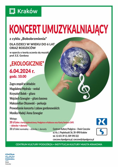 Zapraszamy na koncert gordonowski - umuzykalniający z cyklu Bobobrzmienia "Ekologicznie", który odbędzie się w sobotę 6 kwietnia 2024 r. o godz. 10.00 w Dworze Czeczów.