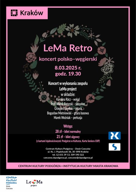 Zapraszamy na koncert polsko-węgierski w wykonaniu LeMa Projekt, który odbędzie się w sobotę 8 marca2025 r. o 19.30 godzinie w Dworze Czeczów.