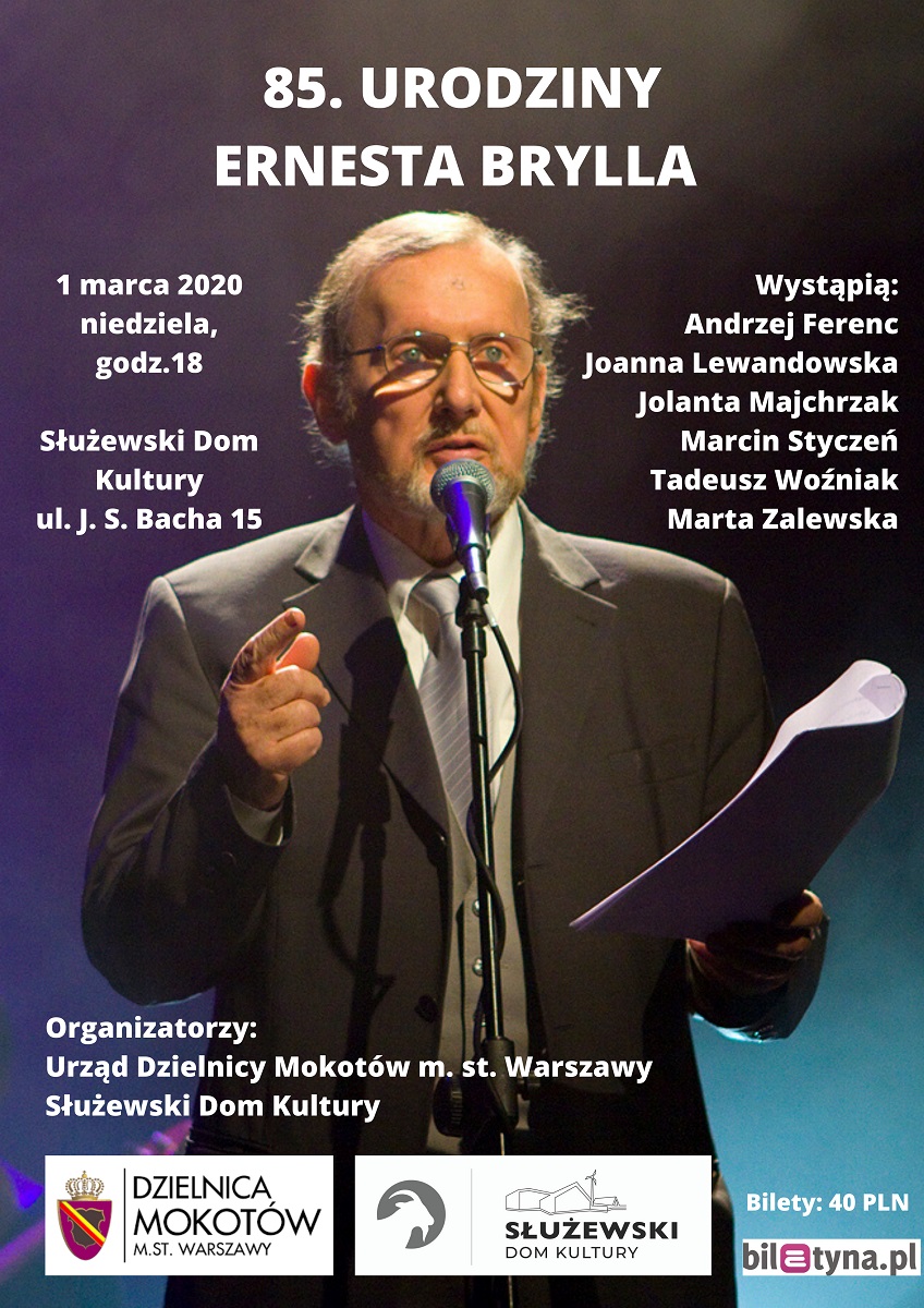 Koncert urodzinowy Ernesta Brylla, jednego z najwybitniejszych polskich poetów współczesnych. 1 marca 2020 roku poeta kończy 85 lat. Uroczystość będzie miała charakter wieczoru autorskiego, niezwykle naturalnego i spontanicznego. Na scenie pojawi się sam poeta, który jest wytrawnym mówcą i gawędziarzem. Jego wiersze będzie czytał wybitny aktor Andrzej Ferenc, a piosenki zaśpiewają Tadeusz Woźniak z małżonką Jolantą Majchrzak, Joanna Lewandowska, Marcin Styczeń oraz Marta Zalewska.