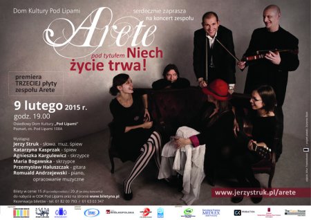 W poniedziałkowy wieczór serdecznie zapraszamy na koncert pt. Niech życie trwa! premierę trzeciej autorskiej płyty zespołu Arete. Na scenie Domu Kultury „Pod Lipami” w Poznaniu, artyści wystąpią w pełnym składzie: