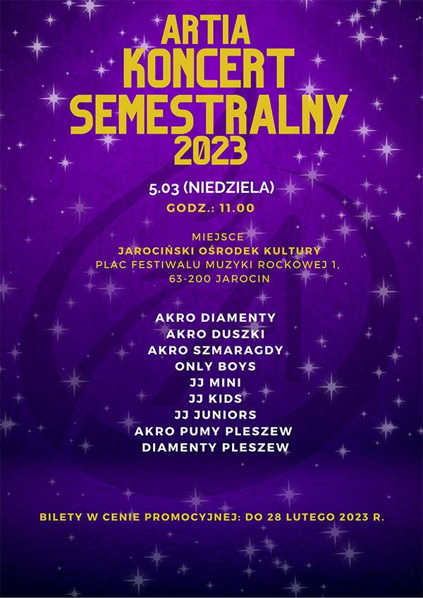 Już 5 marca odbędzie się naprawdę wyjątkowe wydarzenie – KONCERT SEMESTRALNY. W tym roku dzieci i młodzież z Artii Akademii Artystycznej zaprezentują swoje umiejętności na scenie Jarocińskiego Ośrodka Kultury. Każdy z występujących otrzyma upominek, dzięki któremu wydarzenie pozostanie na długo w jego pamięci oraz poczuje się jak artysta, którego dotychczasowa praca nad umiejętnościami została doceniona. Duża scena, profesjonalne oświetlenie i nagłośnienie oraz garderoby już czekają na naszych artystów. Co więcej, dzieci oraz młodzież będą mogli wzajemnie pooglądać swoje występy - zostały wydzielone miejsca na widowni, tak aby każda osoba mogła poczuć atmosferę tego pokazu. Niezapomniane chwile zostaną uwiecznione przez zawodowego fotografa.