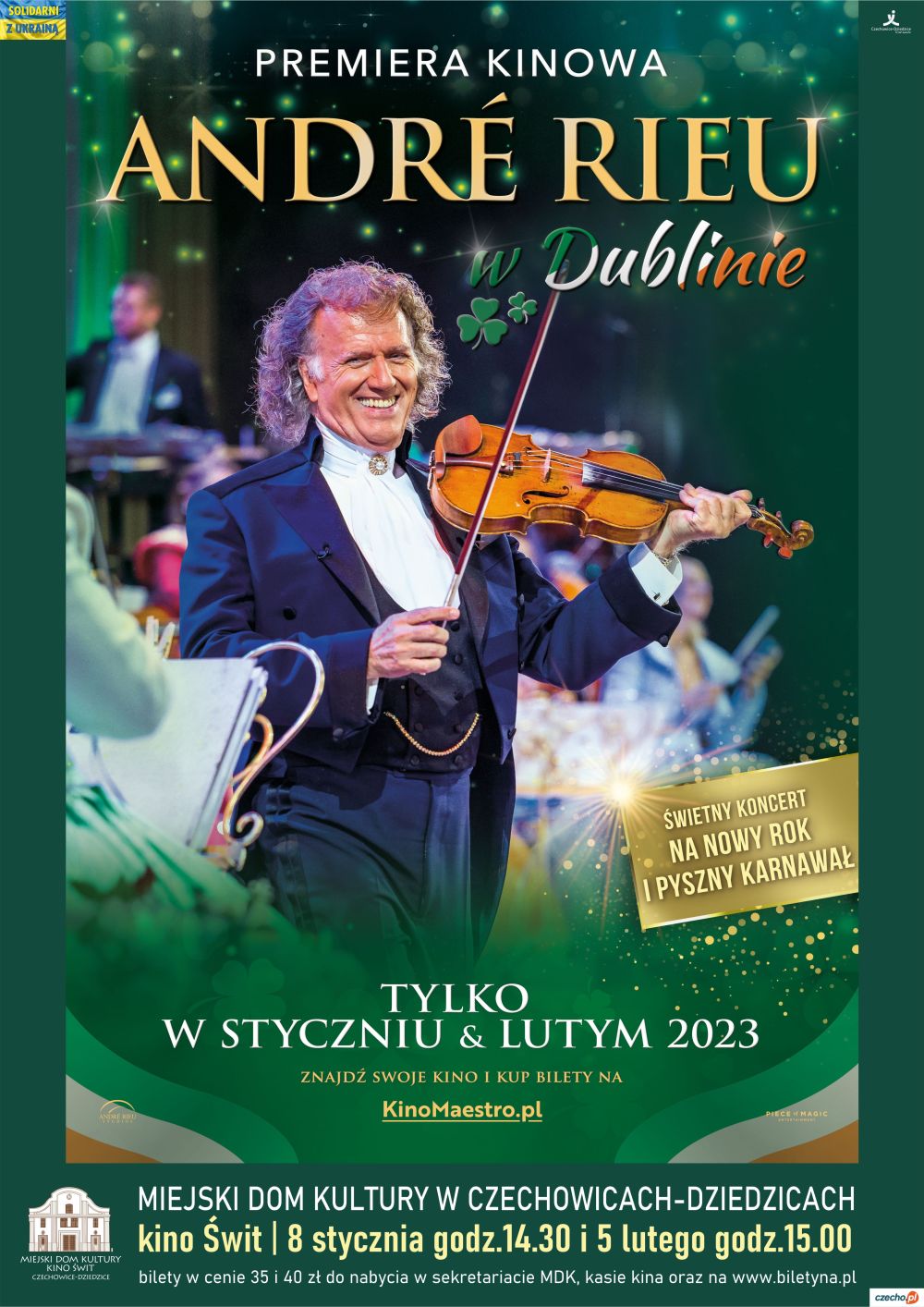 Ubóstwiany przez miłośników muzyki i widzów kinowych całego świata maestro zaprasza nas tym razem do Dublina. Zabierzmy więc do tej przepełnionej zielenią stolicy Irlandii swoich bliskich i przyjaciół – za pośrednictwem kinowej retransmisji!Wszyscy doskonale pamiętamy wspaniały letni koncert z Maastricht „Niech znów nastaną szczęśliwe dni!”. Już podczas niego André Rieu zapowiadał nam kinową podróż do Dublina. Dziś mówi jeszcze to: „Nowy Rok i karnawał to specjalny czas. Wraz z rodziną i przyjaciółmi z nadzieją patrzymy na nadchodzący rok. Mam nadzieję, że nasz dubliński koncert tylko utrzyma Was, kochani widzowie kinowi, w optymistycznym nastroju. Zacznijmy rok 2023 pięknym walczykiem lub dwoma! Moja wspaniała Orkiestra Johanna Straussa i ja nie możemy się już doczekać, żeby »zobaczyć« się z Wami w kinach”.André Rieu i powołana przez niego do życia Orkiestra Johanna Straussa występują na całym świecie od ponad 35 lat. Ich koncerty, przepełnione piękną muzyką, to niezwykłe i barwne widowiska. Rocznie ogląda je na żywo ponad pół miliona melomanów. Dodatkowe kilkaset tysięcy cieszy się nimi za pośrednictwem kinowych retransmisji.Zacznijmy więc wspólnie 2023 rok z André i jego orkiestrą przy dźwiękach walczyków, marszy, słynnych operowych i operetkowych arii oraz największych przebojów muzyki popularnej. Do zobaczenia przed wielkim ekranem!Prowadzenie koncertu: Charlotte Hawkins