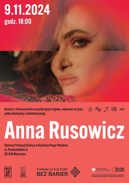 ANIA RUSOWICZ Akustycznie. Najbarwniejszy Kwiat współczesnego big-bitu i polskiego psychodelicznego blues-rocka, zjawiskowa Ania Rusowicz zaśpiewa koncert w ramach projektu Rock’AD’Roll 2024, dofinansowanego przez Ministerstwo Kultury iDziedzictwa Narodowego, przygotowanego przez Fundację Kultury bez Barier od 12 lat działającą na rzecz dostępnej kultury.