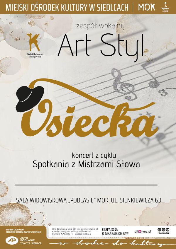 Zespół Wokalny Art Styl od 10 lat pracuje pod kierownictwem Urszuli Chruściel i Marcina Chojeckiego. Od początku swego istnienia na koncertach gromadzi liczną publiczność, której bliskie są utwory, po które sięga zespół i na nowo interpretuje. Dotychczas w czasie koncertów zespołu mogliśmy usłyszeć utwory różnorodnych artystów, w dziesiątym roku swojej pracy Art Styl rozpoczyna cykl koncertów pt. „Spotkania z Mistrzami Słowa”. Koncert – Osiecka” poświęcony jest twórczości Agnieszki Osieckiej – poetki, autorki tekstów piosenek, pisarki, reżyserki teatralnej i telewizyjnej, dziennikarki.