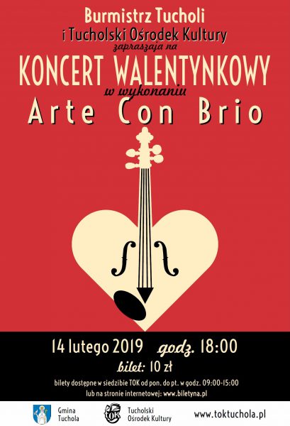 Burmistrz Tucholi oraz Tucholski Ośrodek Kultury zapraszają na Koncert Walentynkowy w wykonaniu zespołu „Arte Con Brio”, który odbędzie się 14 lutego 2019 r. o godz. 18:00 w sali widowiskowej TOK. Bilety w cenie 10 zł/osoba.