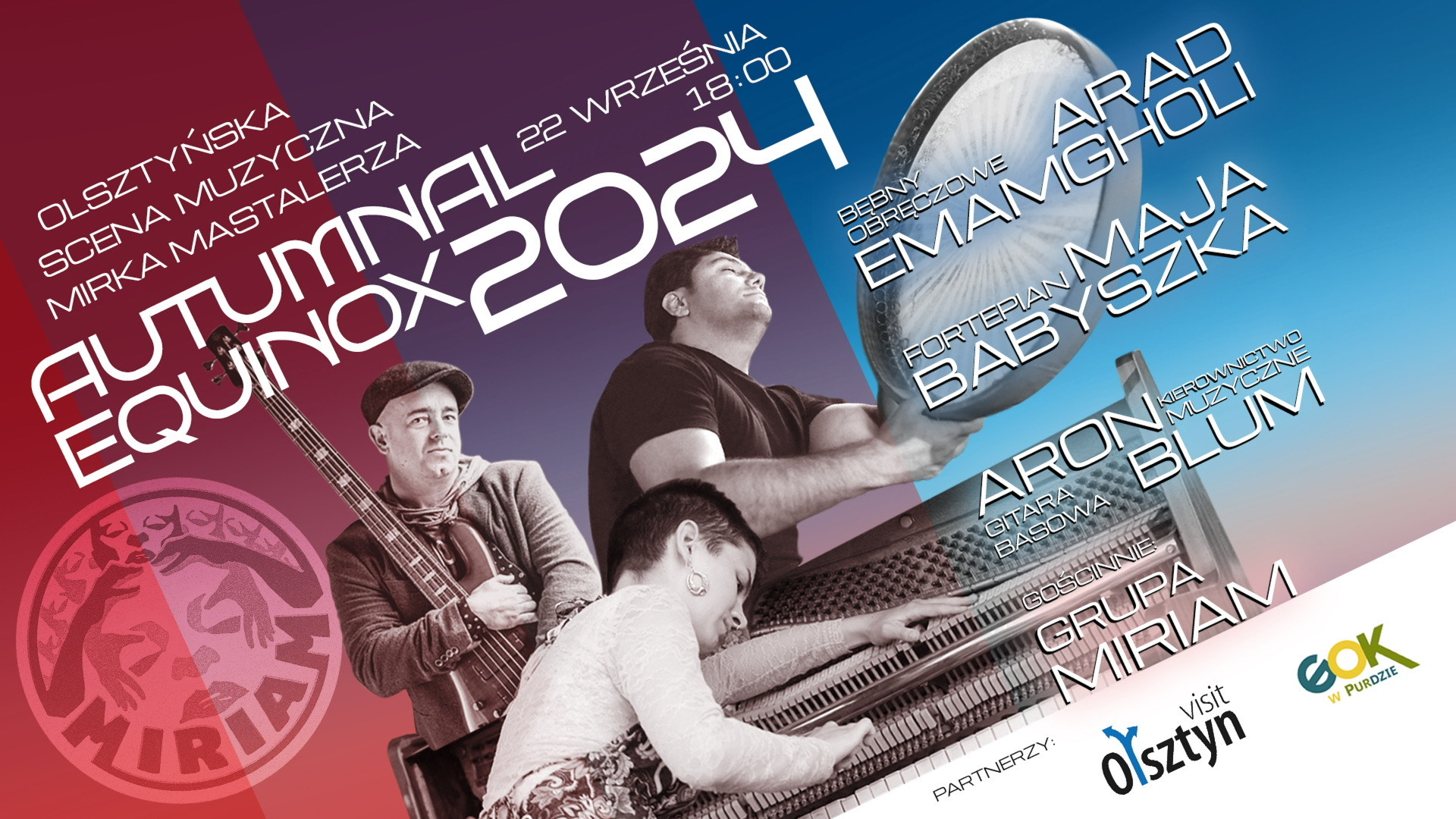 Na Olsztyńskiej Scenie Muzycznej Mirka Mastalerza połączą siły; znana tu z wielu znakomitych koncertów Mają Babyszka, wirtuoz bębna obręczowego Daf- Arad Emamgholi i pomysłodawca koncertu Aron Blum na gitarze basowej, z gościnnym udziałem Grupy Bębnów Obręczowych MIRIAM pod jego kierownictwem.
