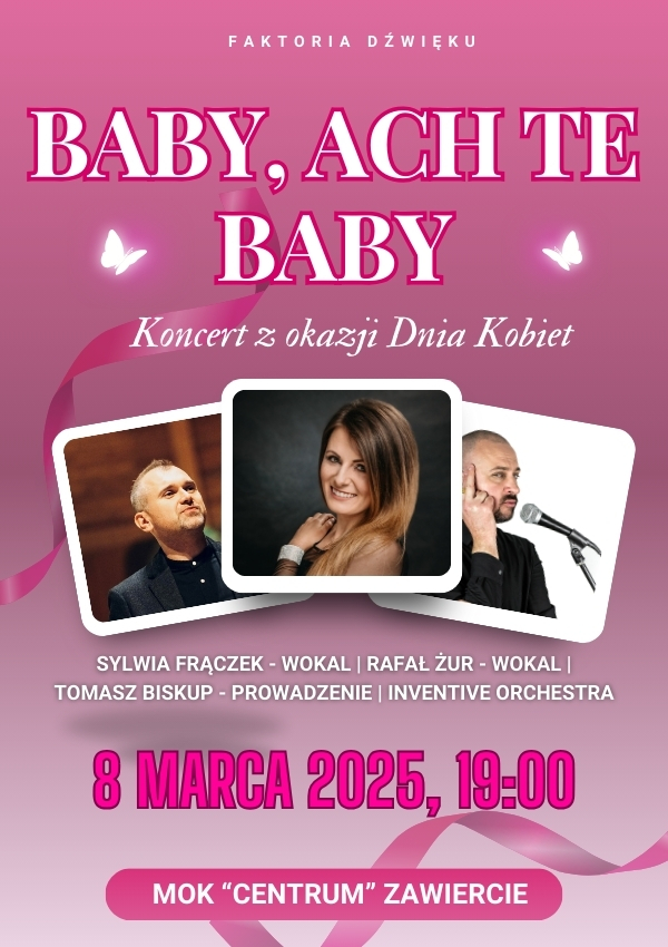 Z okazji Dnia Kobiet zapraszamy na pełen emocji i humoru koncert "Baby, ach te baby", który przeniesie widzów w świat niezapomnianych polskich przebojów! Na scenie rozbrzmiewać będą ikoniczne utwory takich mistrzów jak Alicja Majewska, Irena Santor, Andrzej Zaucha czy Zbigniew Wodecki. Nie zabraknie również światowych hitów z repertuaru takich artystów jak W. Houston, M. Buble czy T. Jones.