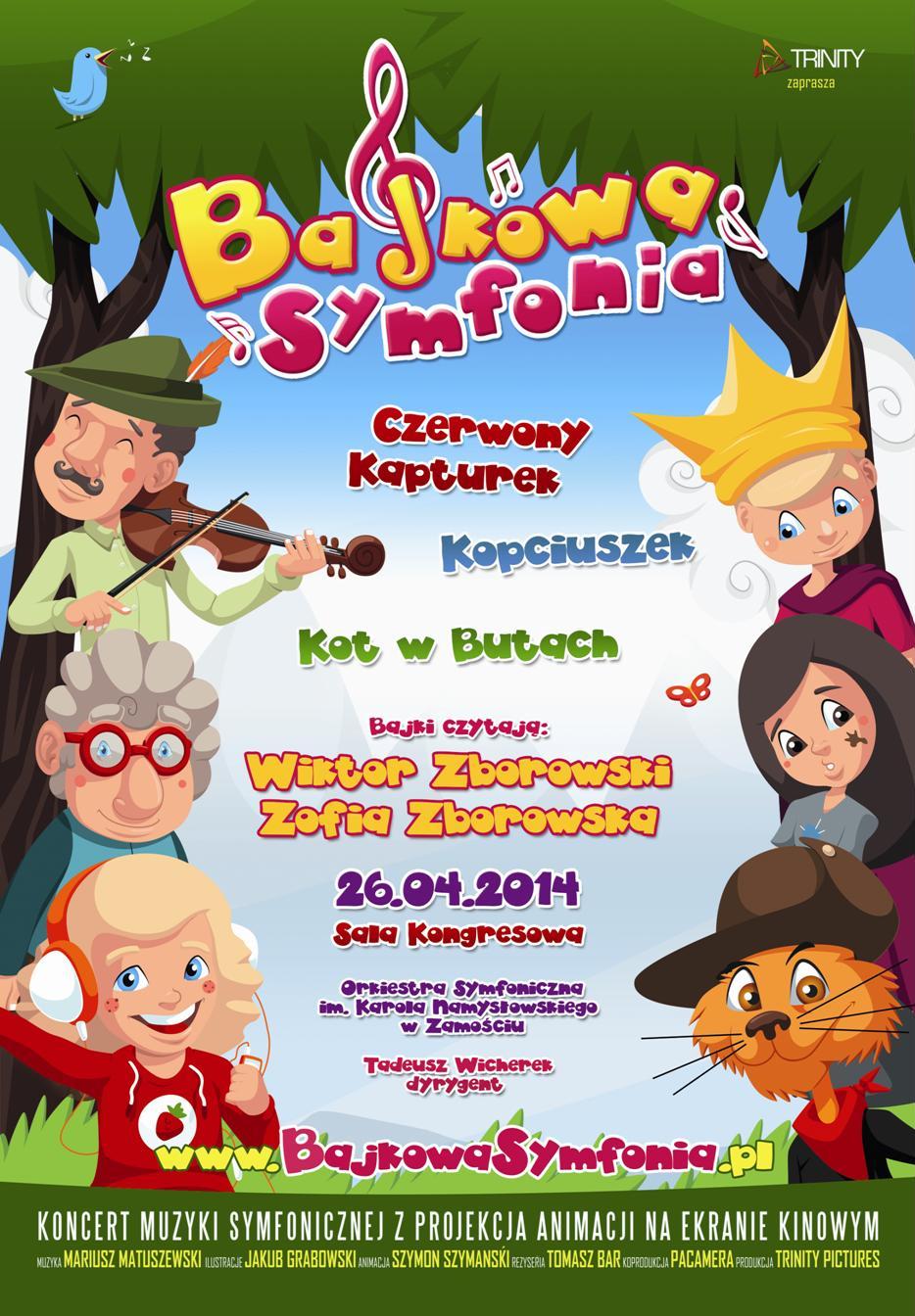 "Bajkowa Symfonia" to pierwszy polski koncert filmowy przygotowany z myślą o najmłodszych. Wykonywanym na żywo przez orkiestrę symfoniczną barwnym kompozycjom towarzyszyć będzie projekcja na ekranie kinowym specjalnie na tę okazję stworzonych animacji. Młodych melomanów w niezwykły świat muzyki wprowadzą znane i lubiane postaci z „Kopciuszka”, „Kota w butach” oraz „Czerwonego kapturka”. W bajkowych gawędziarzy wcielą się Wiktor Zborowski wraz z córką Zofią Zborowską. Koncert pod figlarną batutą dyrygenta Tadeusza Wicherka rozniesie się po sali za sprawą zamojskiej Orkiestry Symfonicznej im. Karola Namysłowskiego.