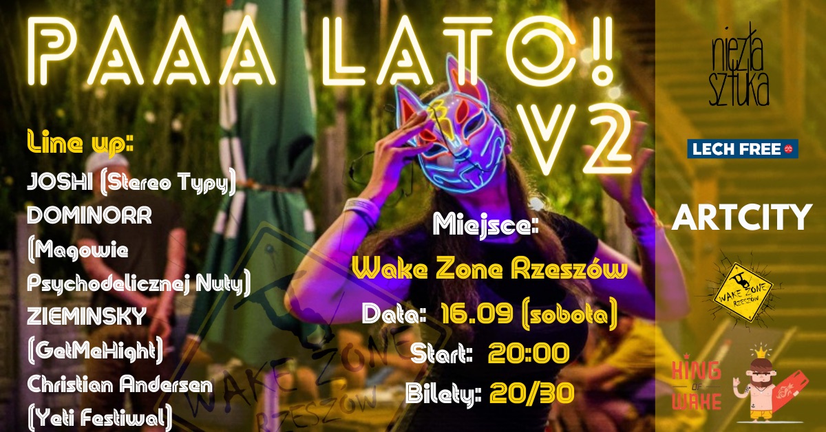 Na plaży w WAKE ZONE RZESZÓW, znowu łączymy siły z najlepszymi ekipami, i znów żegnamy lato, potężnym podmuchem dźwięków prosto z wody! To najprawdopodobniej ostatnia okazja w tym roku, aby poszaleć - i to w towarzystwie instalacji świetlnych - na świeżym powietrzu!