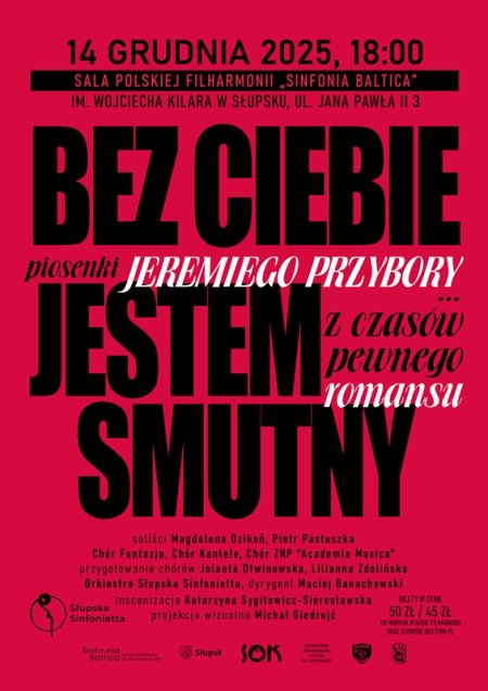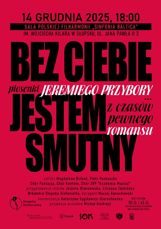 Serdecznie zapraszamy na pełen wzruszeń koncert poświęcony romansowi Jeremiego Przybory i Agnieszki Osieckiej. W programie znajdą się zarówno piosenki do tekstów będących wyrazem miłości dwojga poetów, jak i fragmenty korespondencji i wspomnień. Solistami będą Magdalena Dzikoń i Piotr Pastuszka, których głosy przeniosą Państwa w świat poezji. Wystąpią również chóry - Fantazja przygotowany przez Liliannę Zdolińską oraz Kantele i ZNP "Academia Musica" przygotowane przez Jolantę Otwinowską. Autorem projekcji wizualnej jest Michał Giedrojć, a za inscenizację odpowiada Katarzyna Sygitowicz - Sierosławska. Orkiestrę poprowadzi autor wszystkich aranżacji - Maciej Banachowski.
