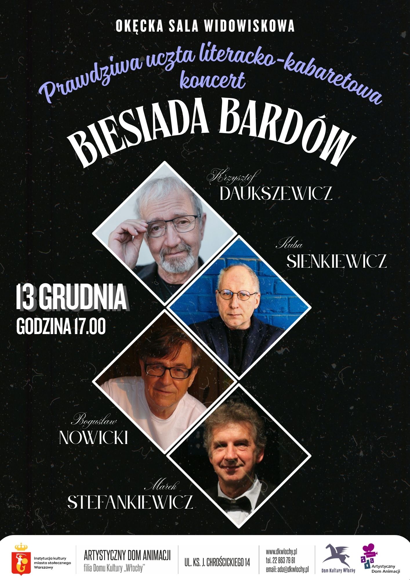 Zapraszamy na wyjątkowe, blisko trzygodzinne wydarzenie – „Biesiadę Bardów”, czyli literacko-kabaretową ucztę słowa, muzyki i satyry w mistrzowskim wykonaniu.