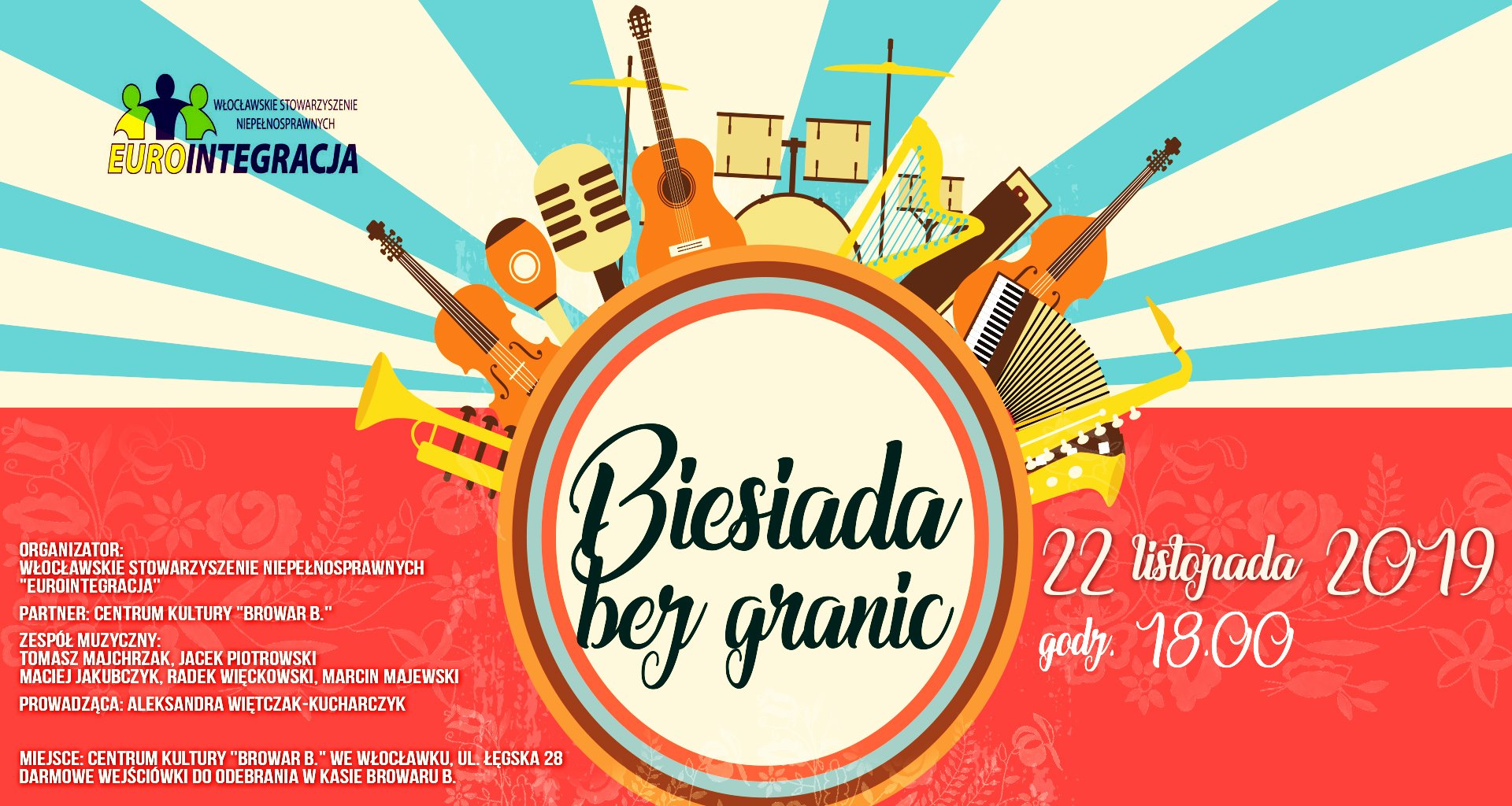 Włocławskie Stowarzyszenie Niepełnosprawnych "Eurointegracja" zaprasza na wesołą imprezę z udziałem m.in. Zespołu Pieśni i Tańca "Kujawy", zespołu muzycznego w składzie: Tomasz Majchrzak, Jacek Piotrowski, Maciej Jakubczyk, Radek Więckowski, Marcin Majewski oraz członków Eurointegracji.