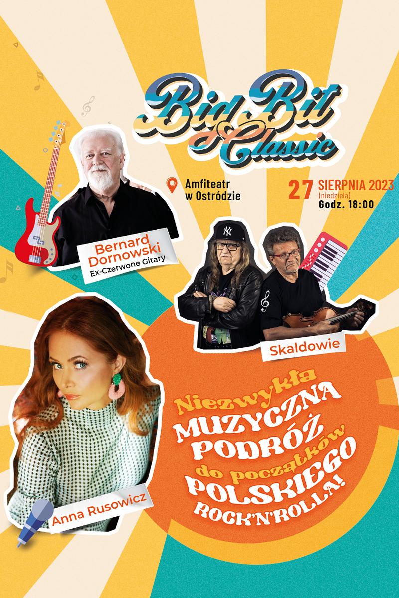 Zapraszamy na BigBit Classic, czyli festiwal polskiej muzyki z lat 60. i 70. ubiegłego wieku, muzyczną podróż do początków polskiego rock’n’rolla. Wystąpią: Bernard Dornowski z zespołem (wokalista, gitarzysta i współzałożyciel Czerwonych Gitar), zespół Skaldowie w oryginalnym składzie, a gwiazdą wieczoru będzie Anna Rusowicz, która kontynuuje muzyczne tradycje mamy Ady Rusowicz występującej m.in. w zespole Niebiesko-Czarni i autorskim repertuarem nawiązuje do czasów hippisowskich.