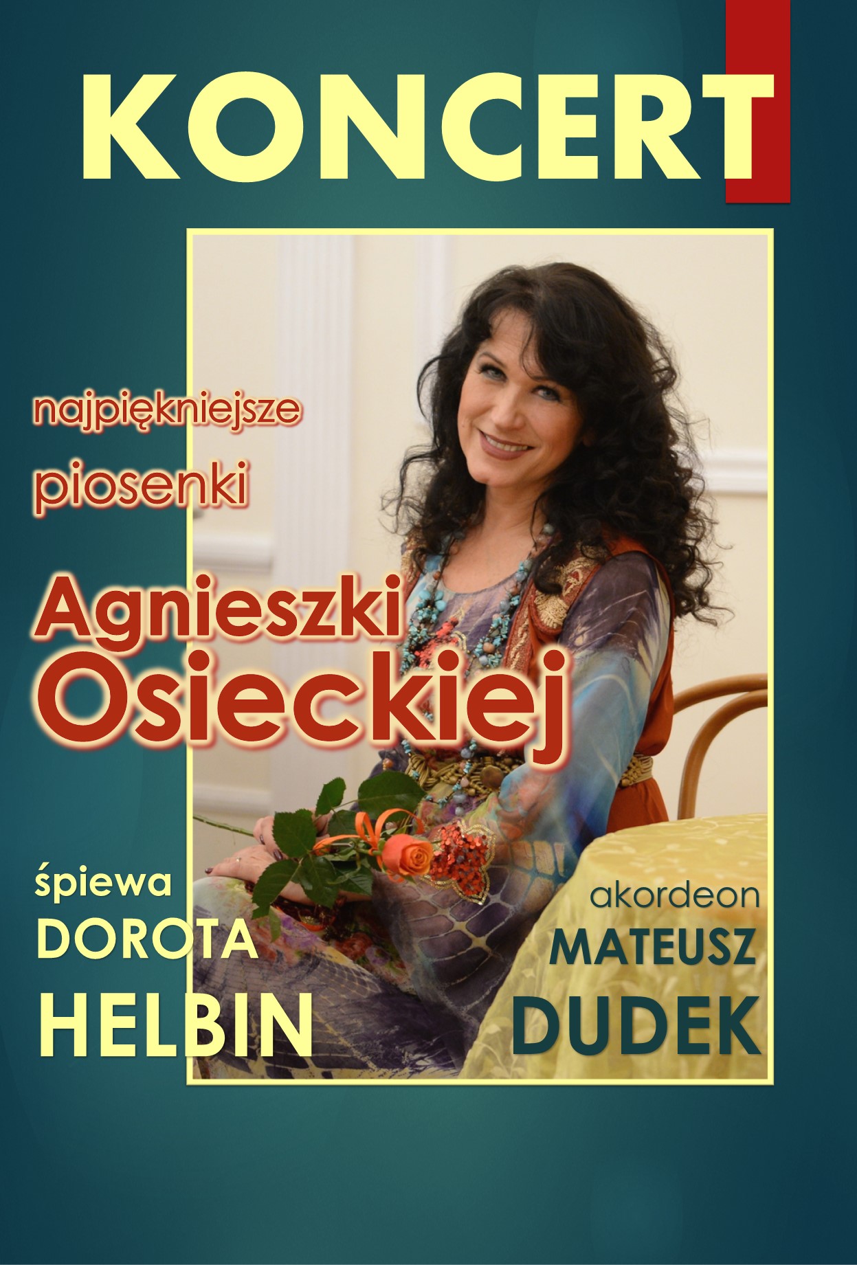 W tym konkretnym koncercie trwającym 1,5h mogą Państwo usłyszeć15 ponadczasowych utworów z doskonałymi tekstami, wspaniałą muzyką, niezwykłą interpretacją oraz ciekawym aranżem przy mistrzowskim akompaniamencie akordeonu guzikowego, fortepianu oraz poznać ciekawe anegdoty z życia Agnieszki Osieckiej.