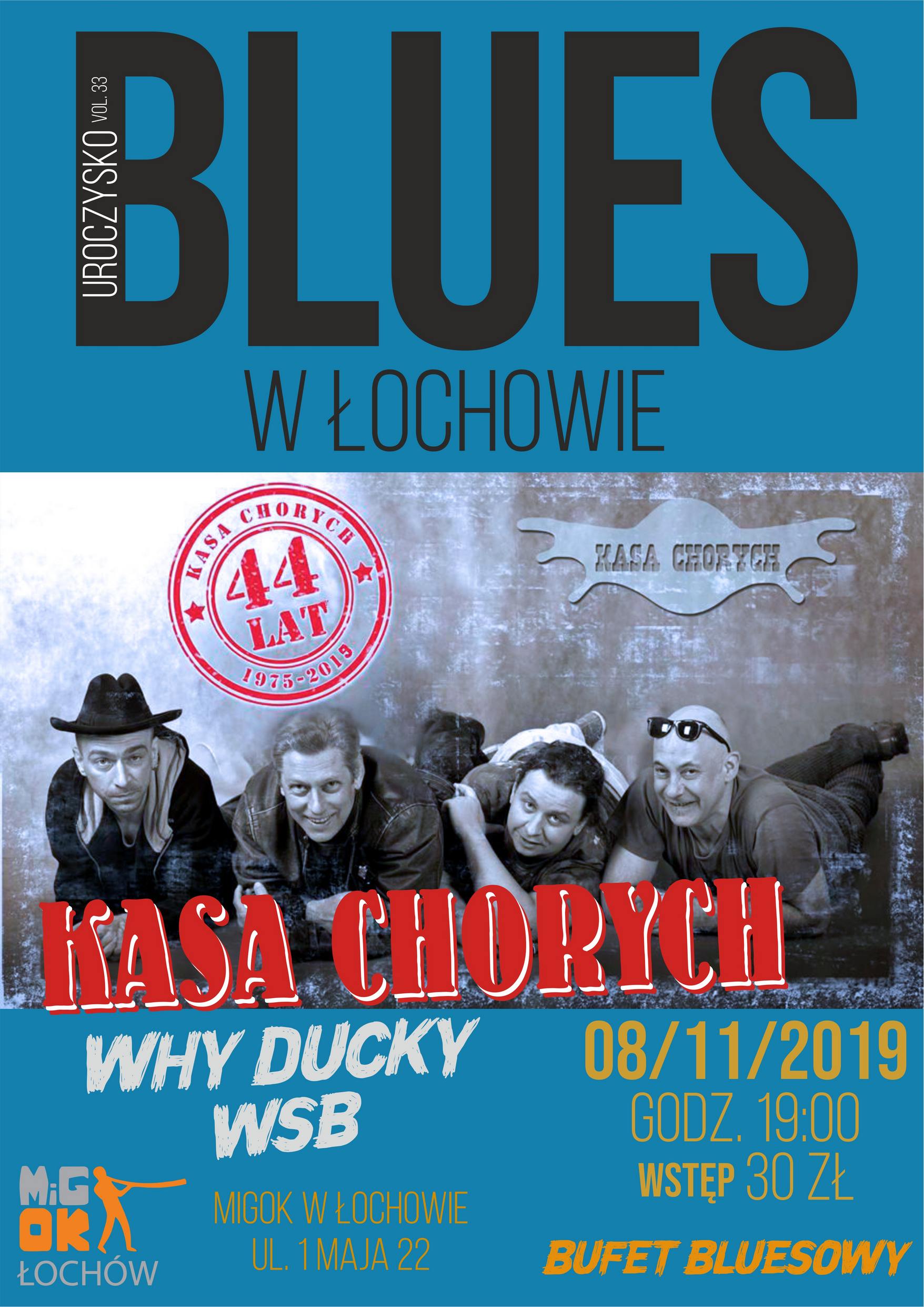 Zapraszamy na wyjątkową imprezę BLUES w Łochowie 08.11.2019. Gościć będziemy legendarną grupę bluesową KASA CHORYCH, WHY DUCKY oraz łochowską załogę WSB. UROCZYSKO VOL 33 - kolejna odsłona! Wstęp 30 zł. oraz bufet bluesowy.