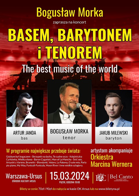 Bogusław Morka zaprasza na koncert "Basem, barytonem i tenorem" w wykonaniu: Bogusław Morka (tenor), Artur Janda (bas), Jakub Milewski (baryton) przy akompaniamencie Orkiestry Marcina Wernera.