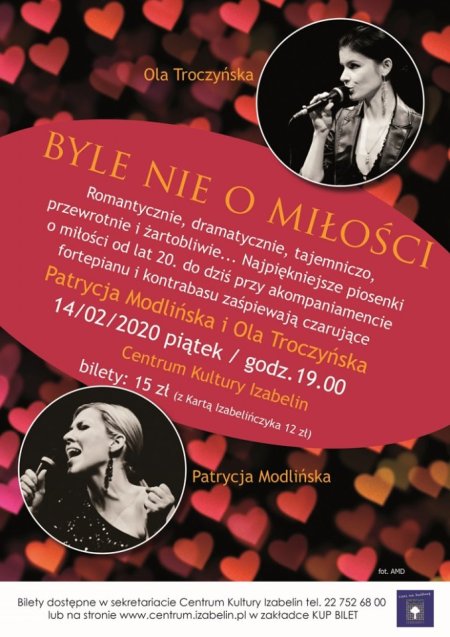 Romantycznie, dramatycznie, tajemniczo, przewrotnie i żartobliwie... Najpiękniejsze piosenki o miłości począwszy od lat 20. do dziś, przy akompaniamencie fortepianu i kontrabasu zaśpiewają czarujące - Patrycja Modlińska i Ola Troczyńska, 14 lutego (piątek), godz. 19.00, Centrum Kultury Izabelin.
