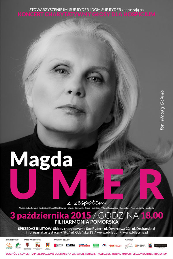 Koncert charytatywny "GŁOSY DLA HOSPICJUM" Stowarzyszenia Sue Ryder. W tym roku na koncert do Filharmonii Pomorskiej 3 października zaprosiliśmy Magdę Umer wraz z zespołem. Artystka zaśpiewa znane, piękne piosenki do tekstów m.in. Agnieszki Osieckiej, Jeremiego Przybory, Jonasza Kofty, Wojciecha Młynarskiego czy Andrzeja Poniedzielskiego.