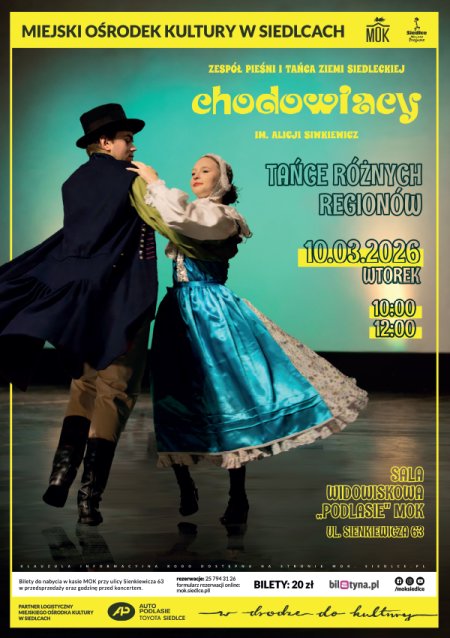 Barwne stroje, żywiołowe tańce i muzyka, która od pokoleń towarzyszy polskim regionom – tak zapowiada się kolejne wydarzenie z cyklu „Spotkania z folklorem”. Zapraszamy na koncert „Tańce różnych regionów” w wykonaniu Zespołu Pieśni i Tańca Ziemi Siedleckiej „Chodowiacy” im. Alicji Siwkiewicz.