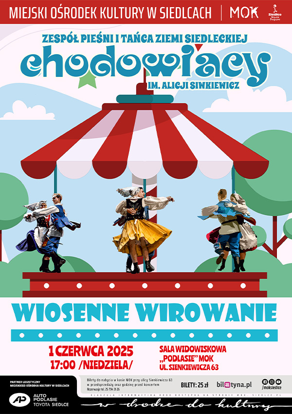 Koncert „Wiosenne wirowanie” to podsumowanie pracy Zespołu Pieśni i Tańca Ziemi Siedleckiej „Chodowiacy” im. Alicji Siwkiewicz w sezonie 2024/2025. Na scenie pokazany zostanie folklor wielu regionów Polski oraz tańce narodowe. Wykonawcami będą członkowie trzech grup – dzieci, młodzież i dorośli – ci którzy przed laty zapisali się do zespołu, ci który przyłączyli się do grupy całkiem niedawno, jak i tacy którzy występowali przez wiele lat, a potem zrobili kilkuletnią przerwę i obecnie ponownie kontynuują swoją przygodę z „Chodowiakami”.