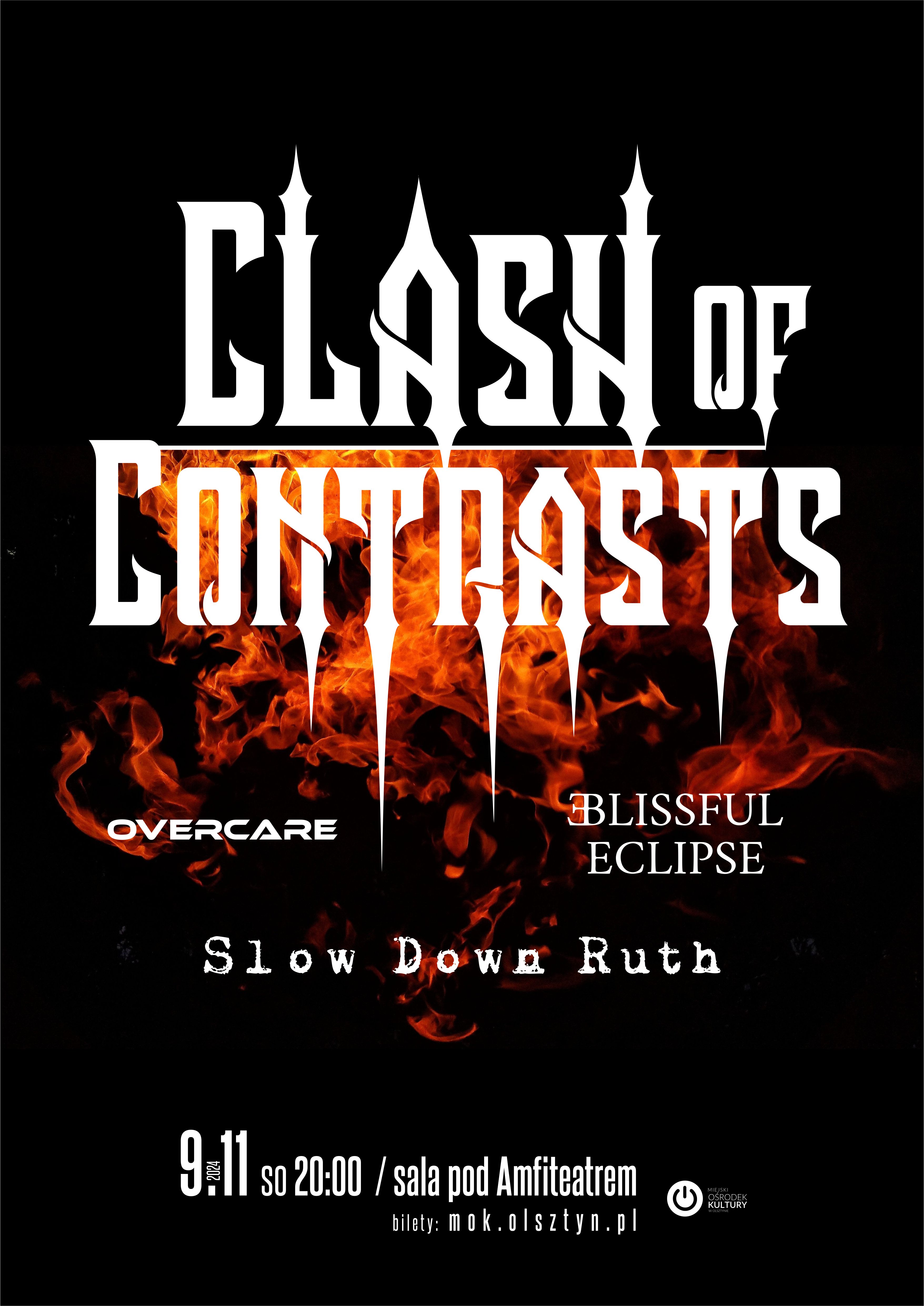 MOK Olsztyn serdecznie zaprasza na CLASH OF CONTRASTS - koncerty aż trzech młodych interesujących kapel z okolic metalu i alternatywy. Wydarzenie odbędzie się w sobotę 9 listopada o godz. 20:00 w sali pod Amfiteatrem.