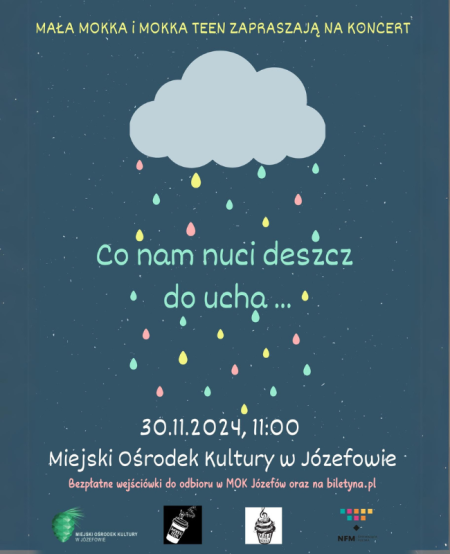 W listopadowe, sobotnie przedpołudnie dziewczęce zespoły wokalne Mała Mokka i Mokka Teen zapraszają na koncert „Co nam nuci deszcz do ucha...”. Będzie jesiennie, kolorowo, sentymentalnie i radośnie. Dzieci i młodzież zaśpiewają specjalnie dla naszej józefowskiej publiczności. Różnorodność repertuarowa pozwoli każdemu znaleźć coś dla siebie. Mała Mokka to zespół dla dziewczynek w wieku 6-10 lat, w Mokka Teen występują nastolatki w wieku 11-16 lat. Grupy dają szansę rozpoczęcia swojej przygody ze śpiewem każdemu dziecku bez względu na poziom umiejętności. Prowadzącymi są Maria Augustyniak i Małgorzata Juras.