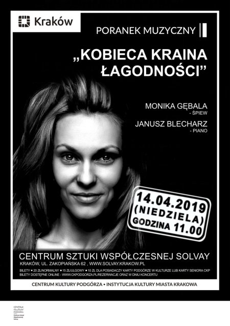 Kobieca kraina łagodności – to koncert w wykonani Moniki Gębali krakowskiej aktorki i wokalistki. Artystka zaprosi nas do świata piosenek w klimacie poetyckim, opowiadającym o trudach codzienności, przyjemnościach i kobiecych sprawach.