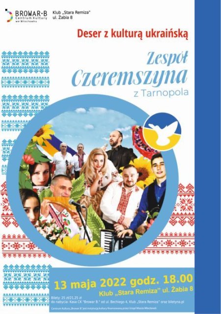 Z cyklu „Deser z kulturą” w Klubie „Stara Remiza” wystąpi ukraiński zespół „Czeremszyna” z Tarnopola. Przy smakach tradycyjnej kuchni ukraińskiej, „Czeremszyna” wykona pieśni ludowe ze swojego regionu. Nie zabraknie także współczesnych przebojów w nowej aranżacji, przy akompaniamencie, m. in. skrzypiec czy akordeonu.