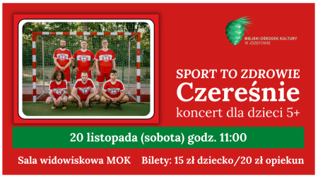 Wyobraź sobie piosenki opowiadające o sprawach najważniejszych: ochronie przyrody, dbaniu o własne zdrowie, miłości do najbliższych, szanowaniu różnorodności. Skierowane do najmłodszych, lecz unikające infantylizacji. Wykonywane w żywiołowej formie, pełnej wspólnych zabaw i interakcji z publicznością. Wyobraź sobie zespół dla dzieci inny niż wszystkie – Czereśnie! Występy Czereśni to także okazja do poznania całej palety instrumentów i ich brzmień: perkusji, bandżo, mandoliny, gitary basowej, a nawet tuby czy klarnetu. Koncert dla dzieci 5+