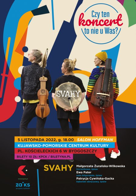 Zapraszamy na ostatni w tym roku koncert z cyklu Czy ten koncert to nie u Was? SVAHY to kobiece trio, wykonujące muzykę na nieoczywistych, dawnych instrumentach, takich jak lira korbowa, bęben obręczowy czy suka biłgorajska. W skład zespołu wchodzą: Małgorzata Żurańska-Wilkowska (lira korbowa, śpiew), Ewa Pater (suka biłgorajska, śpiew) oraz Patrycja Cywińska-Gacka (bębenek obręczowy, śpiew). W repertuarze zespołu znajduje się muzyka kujawska i pałucka.