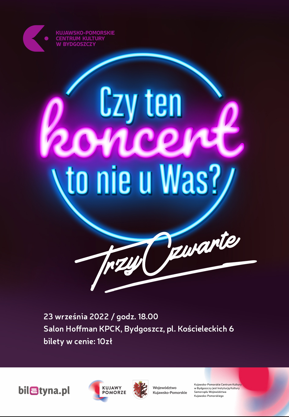 Melomanów zapraszamy na piąty w tym roku koncert z cyklu Czy ten koncert to nie u Was?. TrzyCzwarte to siedmioosobowy zespół złożony ze studentów i absolwentów Akademii Muzycznej w Bydgoszczy, grający muzykę z pogranicza jazzu i szeroko pojętej muzyki improwizowanej. Repertuar oparty jest o autorskie kompozycje członków grupy oraz aranżacje znanych standardów muzyki jazzowej i rozrywkowej. Nazwa zespołu, poza oczywistym nawiązaniem do metrum muzycznego, odwołuje się do składu zespołu, czyli czterech muzyków w sekcji rytmicznej oraz trzech w sekcji dętej. W skład zespołu wchodzą: Sebastian Dembek – saksofon tenorowy, Krzysztof Błaszczak – puzon, Kajetan Sobieraj – trąbka, Kacper Kasprzak – instrumenty klawiszowe, Bartek Werachowski – gitara basowa, Sylwester Bugajak – gitara, Patryk Dolepski – perkusja. Podczas koncertu w KPCK wykonają nieprezentowane do tej pory autorskie kompozycje.