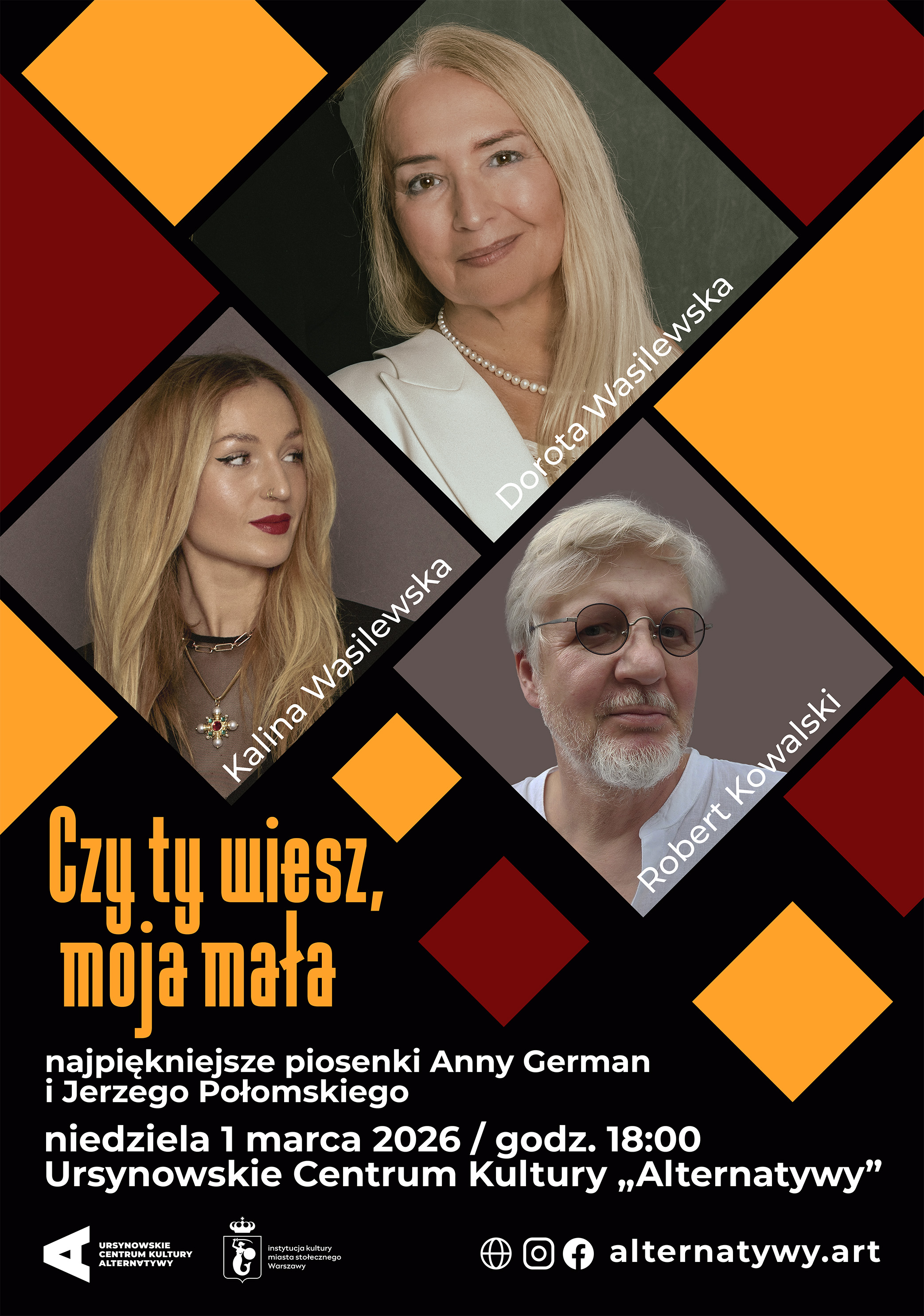 Wieczór poświęcony piosenkom z czasów, gdy muzyka opowiadała historie, a melodia i słowo miały równą wagę. To powrót do epoki, w której kunszt wykonawczy i szacunek dla publiczności stanowiły fundament sceny muzycznej. Najpiękniejsze utwory Anny German i Jerzego Połomskiego wykonają Dorota Wasilewska, Kalina Wasilewska oraz Robert Kowalski. W repertuarze znajdą się m.in. „Człowieczy los”, „Tańczące Eurydyki”, „Mała błękitna chusteczka” oraz „Kodeks”. Wydarzenie nie ma formy klasycznego koncertu – jest kameralnym spotkaniem z publicznością, rozmową, wspomnieniem i wspólnym śpiewaniem.