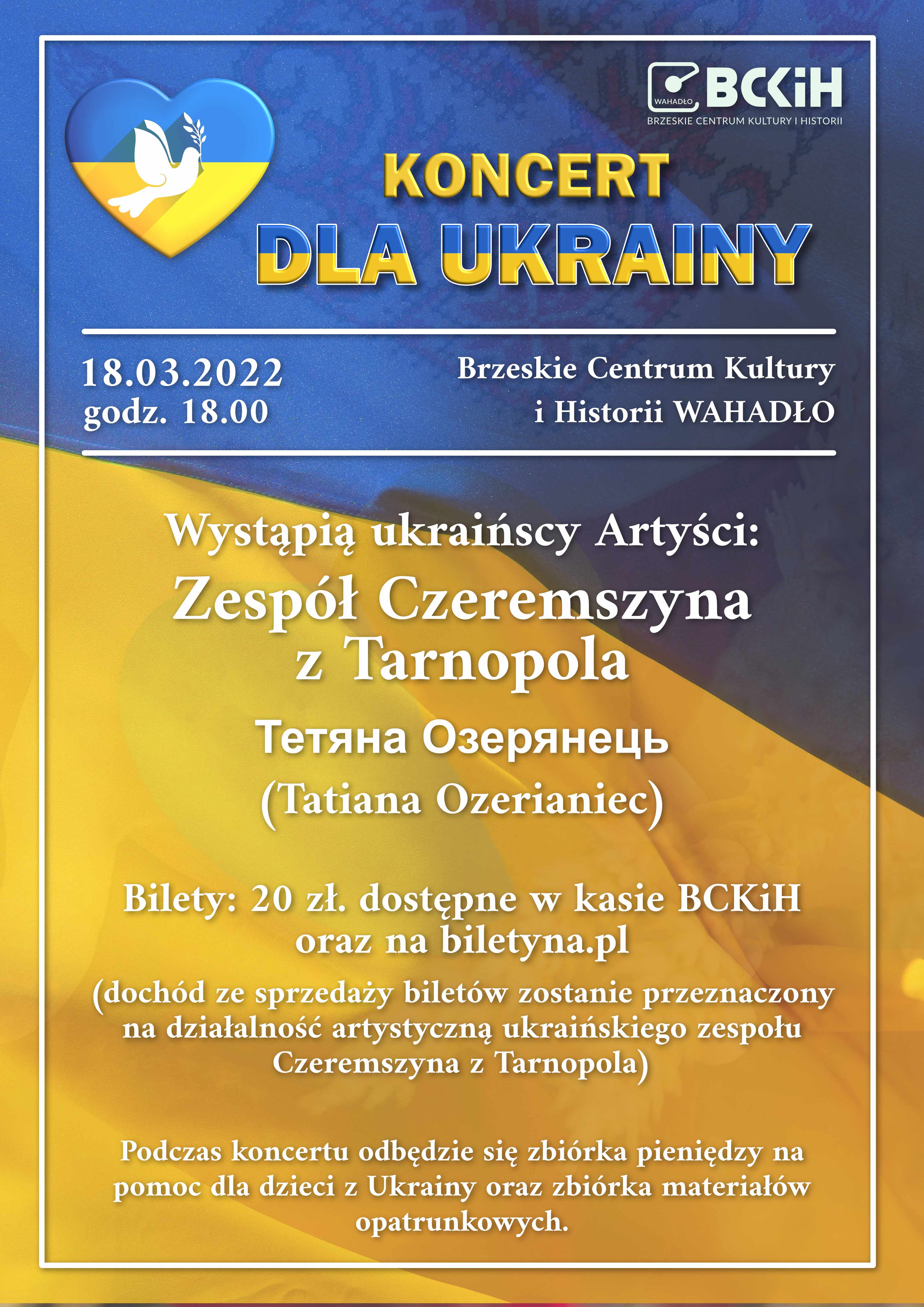 18.02.2022 o godz. 18.00 w Brzeskim Centrum Kultury i Historii "WAHADŁO" w Brześciu Kujawskim odbędzie sie koncert "Dla Ukrainy"