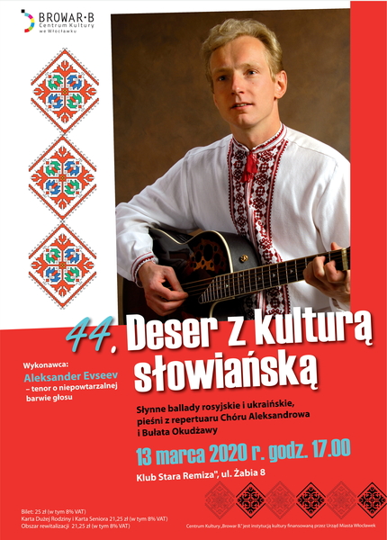 13.03 o godz. 17:00 i 19:00 w Klubie „Stara Remiza” przy ulicy Żabiej 8 odbędzie się już 44. Deser z kulturą. Tym razem w progi „Starej Remizy” zawita kultura słowiańska, a wykonawcą będzie Aleksander Evseev - laureat ukraińskich i międzynarodowych konkursów wokalnych. Ukończył studia na wydziale Sztuki Estradowej w Dniepropietrowsku. Występował na scenach w Kanadzie, Francji, Niemiec, Rosji i Ukrainy. Artysta wykona słynne ballady ukraińskie i rosyjskie, pieśni Bułata Okudżawy oraz pieśni z repertuaru Chóru Aleksandrowa.