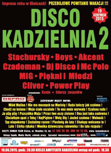 Przyjdźcie, zatańczcie i zaśpiewajcie z całą Kadzielnią takie hity jak: