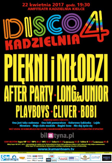 Czwarta edycja najbardziej roztańczonego koncertu roku - Disco Kadzielnia 4 już 22.04.2017 w Amfiteatrze Kadzielnia w Kielcach! Na scenie: Piękni i Młodzi, After Party, Long&Junior, Playboys, Cliver i BOBI.