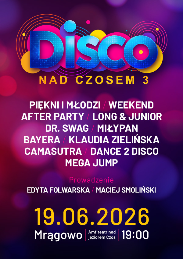Na scenie słynnego mrągowskiego amfiteatru zobaczycie takich artystów jak: Piękni i Młodzi, Weekend, After Party, Long & Junior, Dr. Swag, MiłyPan, Klaudia Zielińska, Bayera, Camasutra, Dance 2 Disco, Mega Jump.