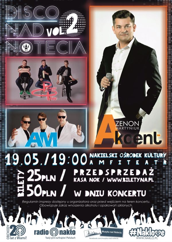 Zapraszamy na kolejny koncert z cyklu Disco nad Notecią. Tym razem wystąpią: Zespół AM, grupa Power Play, a także długo wyczekiwany Akcent, z Zenonem Martyniukiem. Gwarantujemy kilka godzin wspaniałej zabawy.