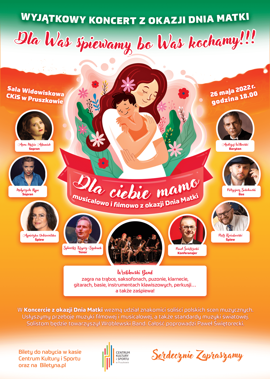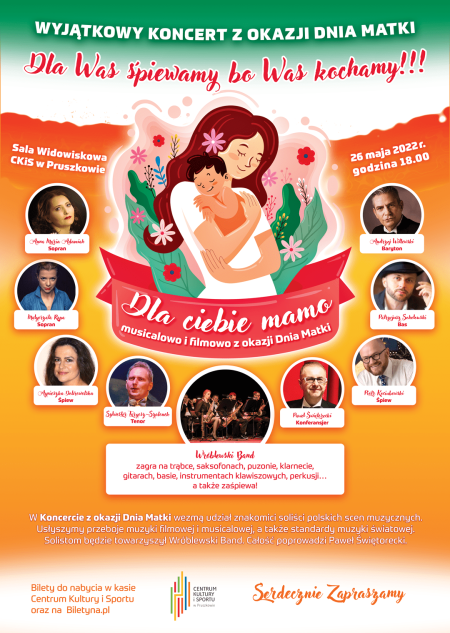 W Koncercie z okazji Dnia Matki wezmą udział znakomici soliści polskich scen muzycznych. Usłyszymy przeboje muzyki filmowej i musicalowej a także standardy muzyki światowej. Solistom będzie towarzyszył Wróblewski Band a całość poprowadzi Paweł Świętorecki.