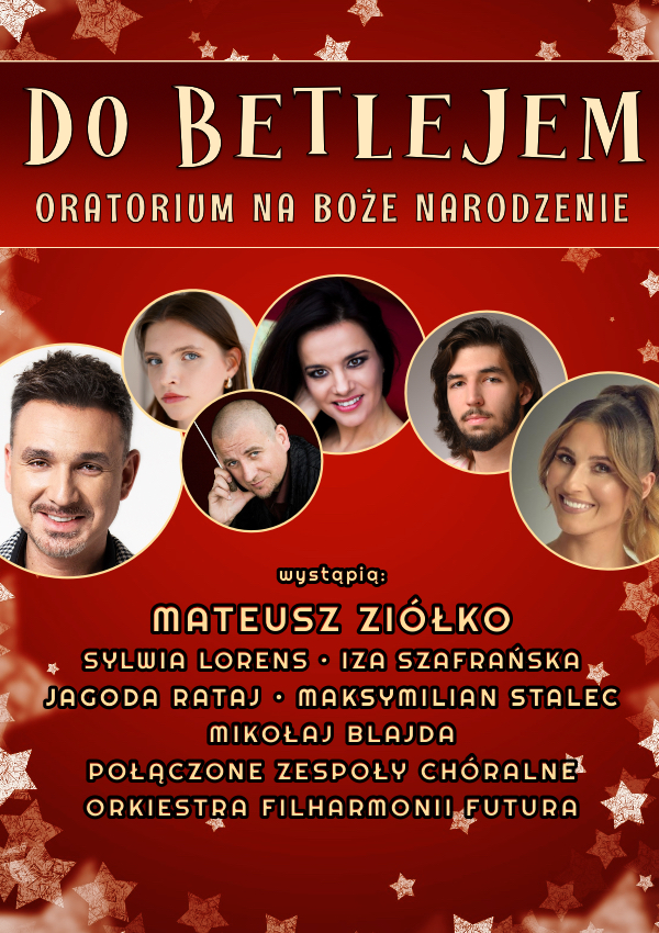 Magiczna, muzyczna podróż "Do Betlejem" z udziałem gwiazd! Mateusz Ziółko, Izabela Szafrańska, Sylwia Lorens, Jagoda Rataj, Maksymilian Stalec oraz połączone chóry dziecięco-młodzieżowe* i orkiestra Filharmonii Futura pod dyrekcją kompozytora - Mikołaja Blajdy zapraszają na jedyny w sezonie 2025/26 ekskluzywny koncert w Filharmonii Podkarpackiej. Oratorium na Boże Narodzenie "Do Betlejem" to współczesne kolędy i pastorałki, napisane do przepięknych tekstów XX wiecznych, polskich poetów. Koncert o familijnym charakterze wprowadza widza w wyjątkowy, bożonarodzeniowy świat. Pełne pozytywnego przekazu świąteczne historie, opowiadane są przez solistów i chóry, którym towarzyszy orkiestra krakowskiej Filharmonii Futura (w sumie ponad 250 wykonawców!). "Do Betlejem" to niepowtarzalne widowisko z udziałem najlepszych głosów polskiej sceny! Czas trwania: 1,5 godz. Organizator: Filharmonia Futura.