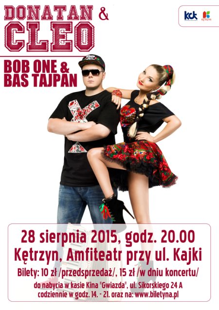 Tuż przed koncertem Donatana & Cleo na kętrzyńskiej scenie pojawi się BAS TAJPAN & BOB ONE . Razem są niezwykle zgranym duetem, ale również każdy z nich z osobna udowadnia swoją klasę. Atakują reggae, dancehall i hip-hopem - "Nie przypuszczam, ja wiem - dobrze będzie!" Bas Tajpan i Bob One od lat są ściśle współpracującym duetem, zarówno w studio jak i na scenie. W 2012 roku nagrali wspólny EP "Wszystko na sprzedaż". Obu śmiało zaliczyć można do czołówki współczesnej polskiej sceny reggae / hip-hop / dancehall. Cieszą się bardzo dużym poparciem fanów - na swoje koncerty przyciągają tłumy a odsłony ich teledysków często można liczyć w setkach tysięcy, a nawet milionach.