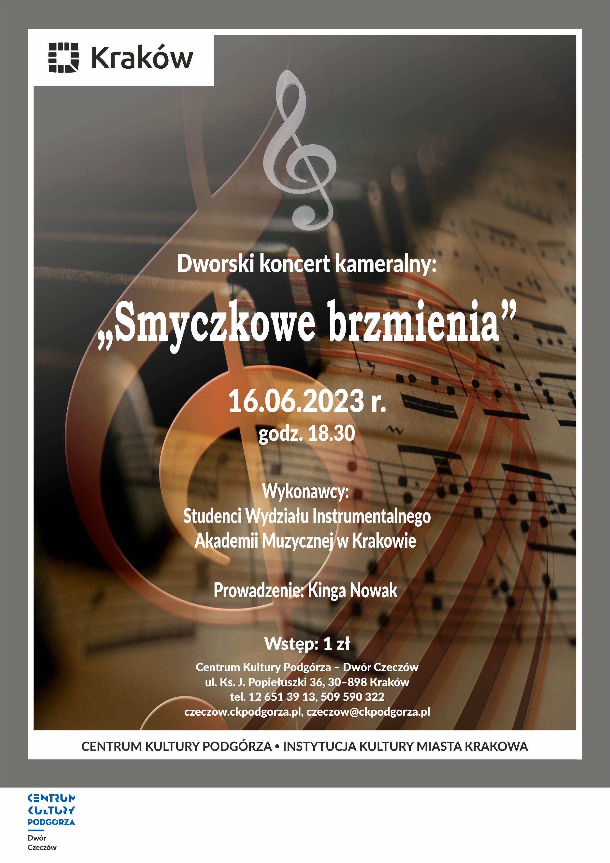 Zapraszamy na koncert pt. "Smyczkowe brzmienia", z cyklu "Dworskie koncerty kameralne", który odbędzie się w piątek 16 czerwca 2023 o godz. 18.30 w Dworze Czeczów.
