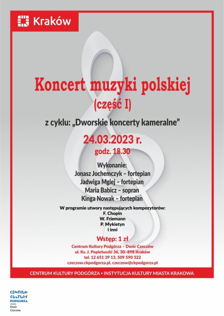 Zapraszamy na koncert muzyki polskiej (część I) z cyklu "Dworskie koncerty kameralne", który odbędzie się 24 marca 2023 o godz. 18.30 w Dworze Czeczów.