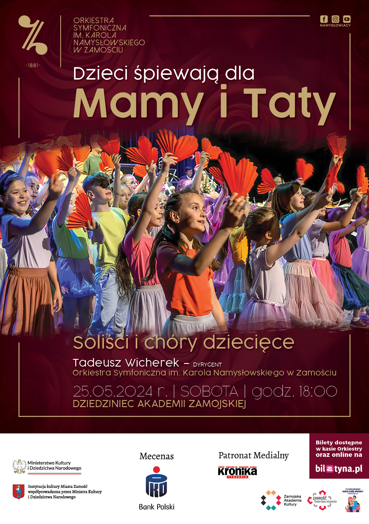 Serdecznie zapraszamy na wyjątkowy koncert pod tytułem "Dzieci śpiewają dla Mamy i Taty", który odbędzie się 25 maja na Dziedzińcu Akademii Zamojskiej. To niezwykłe wydarzenie dedykowane jest rodzicom i wszystkim, którzy cenią piękno muzyki wykonywanej przez dzieci i młodzież.