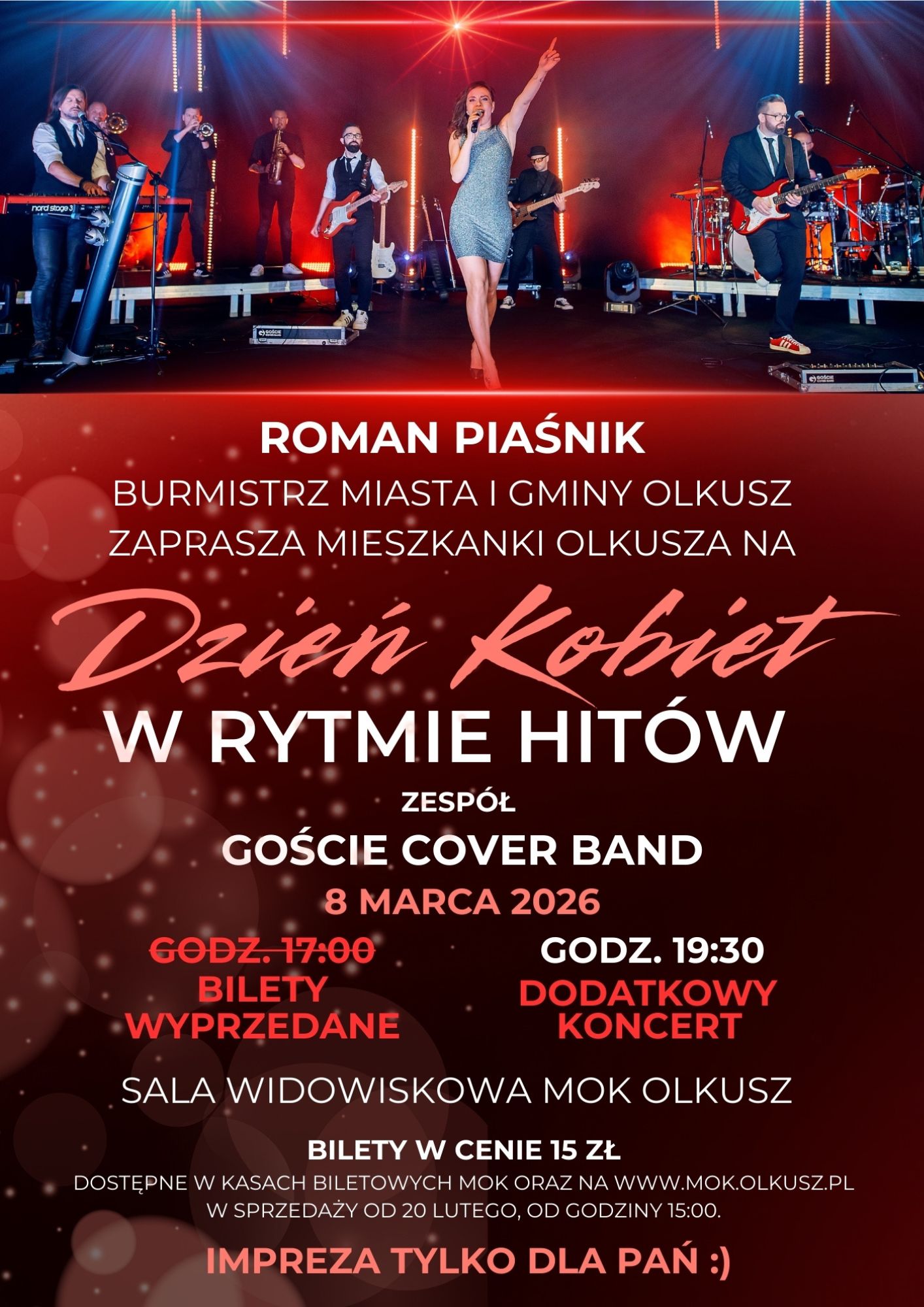 Bilety na koncert z okazji Dnia Kobiet, który odbędzie się 8 marca o godz. 17:00 w sali widowiskowej Miejski Ośrodek Kultury w Olkuszu, wyprzedały się w błyskawicznym tempie. To dla nas najpiękniejszy dowód, jak bardzo lubimy wspólnie świętować ten wyjątkowy dzień.
