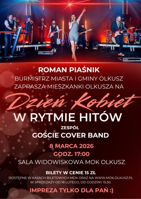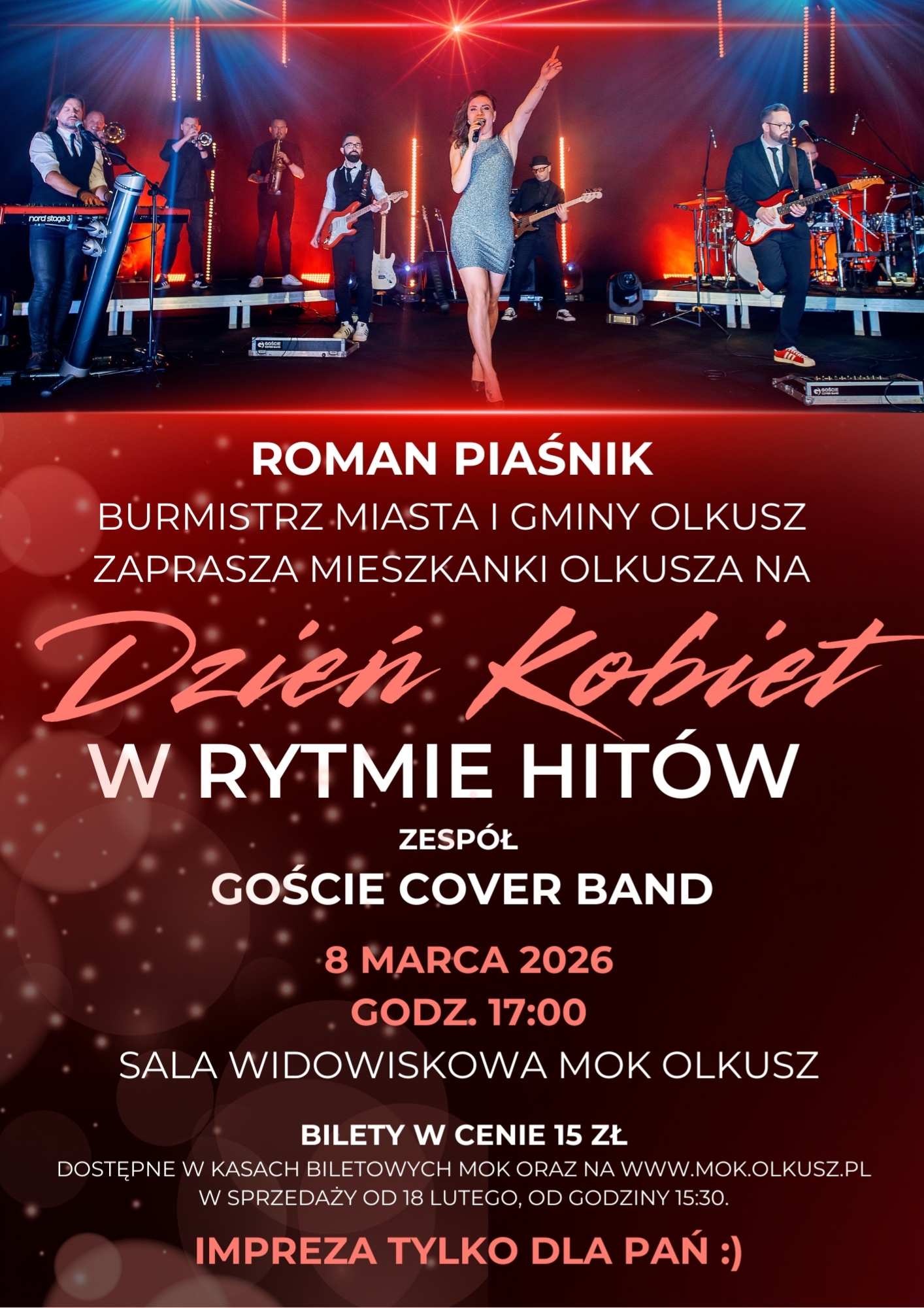 Burmistrz Miasta i Gminy Olkusz Roman Piaśnik zaprasza wszystkie Panie na wyjątkowy koncert z okazji Dnia Kobiet, który odbędzie się w niedzielę 8 marca o godz. 17:00 w sali widowiskowej Miejskiego Ośrodka Kultury w Olkuszu.