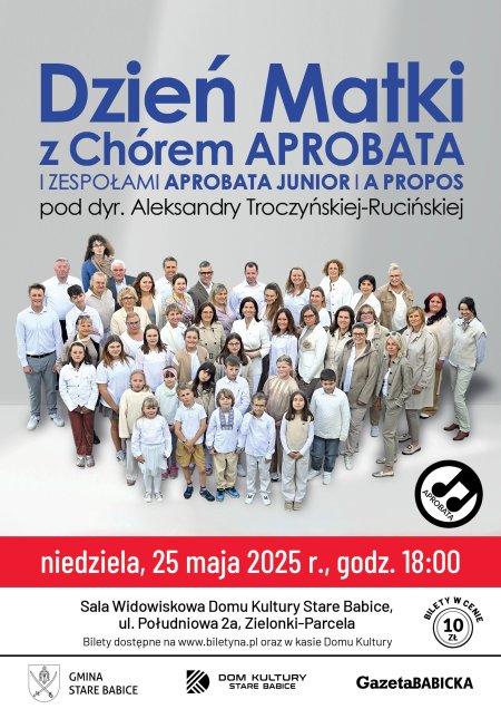 Serdecznie zapraszamy na koncert z okazji Dnia Matki. Na scenie zaprezentuje się Chór Aprobata oraz dzieci i młodzież z zespołów Aprobata Junior i A Propos. W repertuarze przeboje polskiej i światowej muzyki. Piosenki o Mamach i dla Mam. Będzie okazja do wzruszeń, ale i dobrej zabawy oraz wspólnego śpiewania. Zapraszamy!