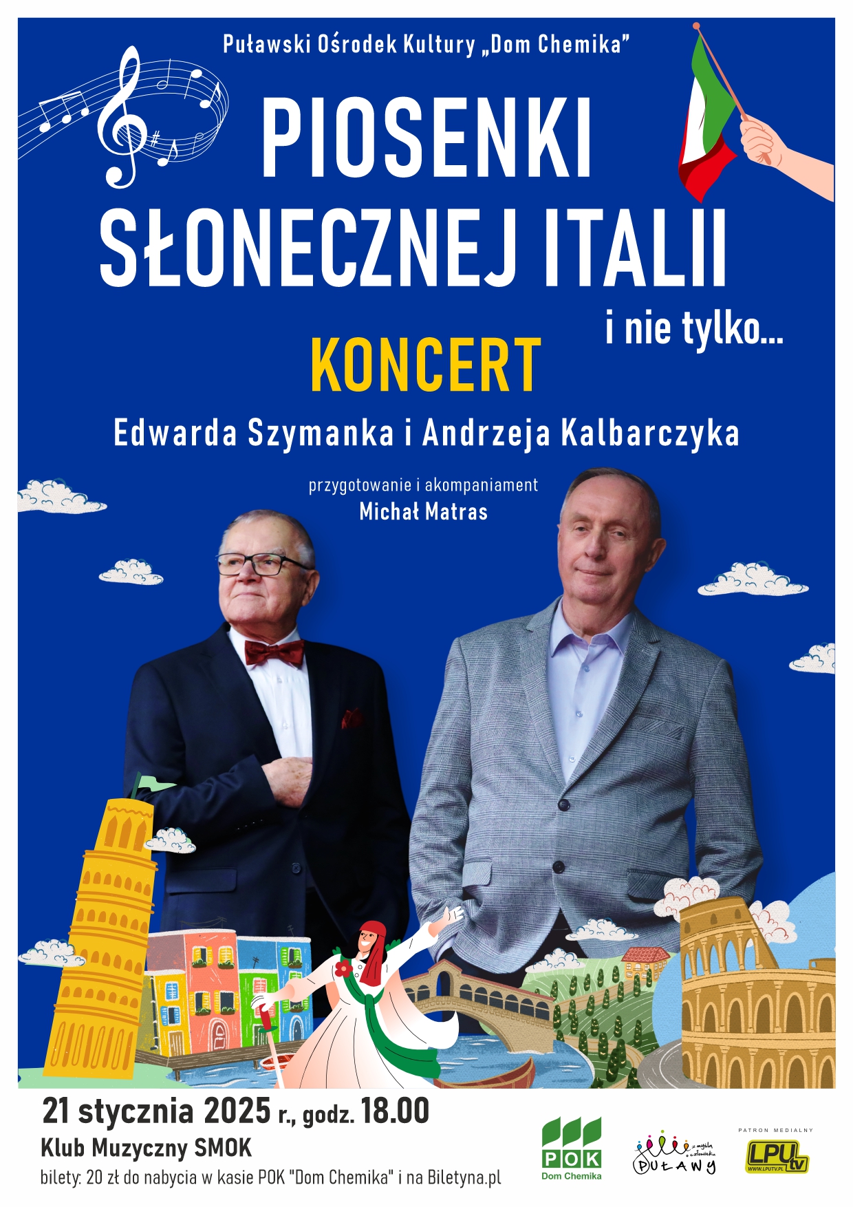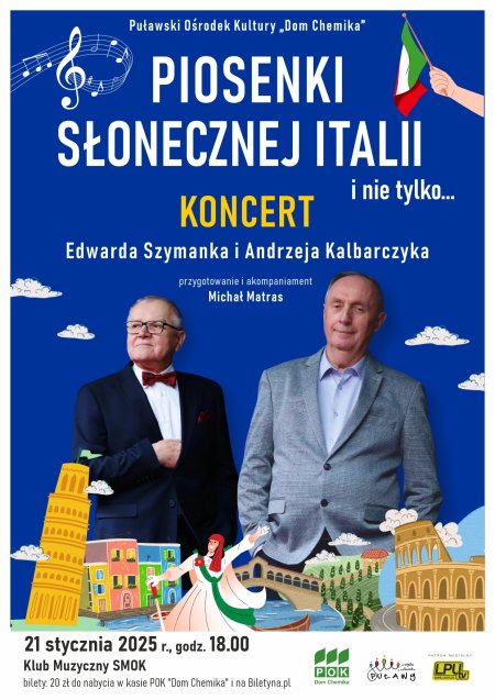 Edward Szymanek i Andrzej Kalbarczyk, członkowie zespołu STARsi, działającego w Puławskim Ośrodku Kultury „Dom Chemika”, w koncercie „Piosenki słonecznej Italii i nie tylko…” zaprezentują nam niezapomniane utwory rodem z włoskich scen muzycznych. Już niebawem odbędzie się wyjątkowy koncert, który przeniesie nas prosto do serca Włoch. Tego wieczoru usłyszymy takie utwory jak „O sole mio”, „Caruso’, „Volare” czy „Torneró”, a także znane i lubiane polskie piosenki Krzysztofa Krawczyka, Jerzego Połomskiego oraz „Kabaretu Starszych Panów”.