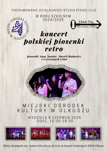 Już 8-go czerwca na scenie Miejskiego Ośrodka Kultury w Olkuszu odbędzie się nasz Koncert Polskiej Piosenki Retro, który w tym roku będzie podsumowaniem działalności naszego Studia Artystycznego.